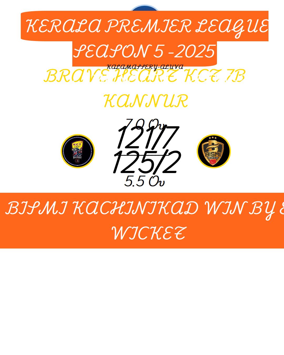 BRAVE HEART KCT 7B KANNUR 109/4 7.0/7 AMAR CITY ULLANAM WIN BY 8 RUNS -