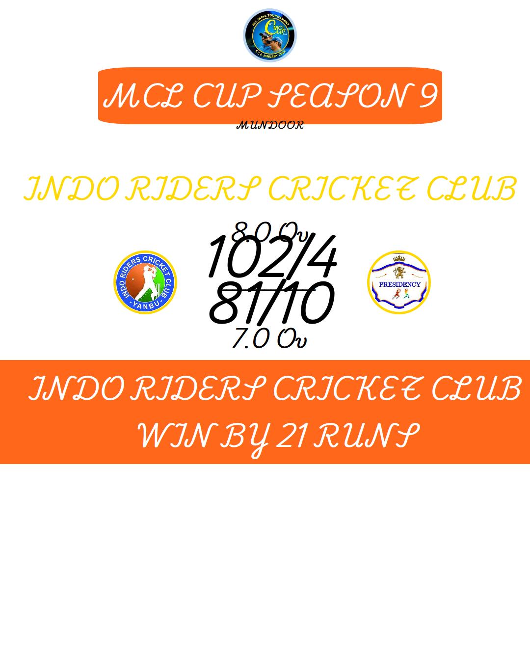 INDO RIDERS CRICKET CLUB WIN BY 21 RUNS