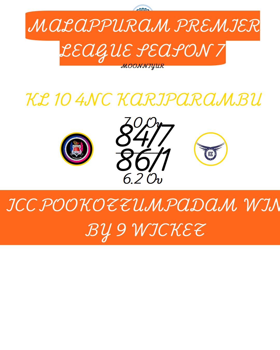 KL 10 4NC KARIPARAMBU WIN BY 9 WICKET