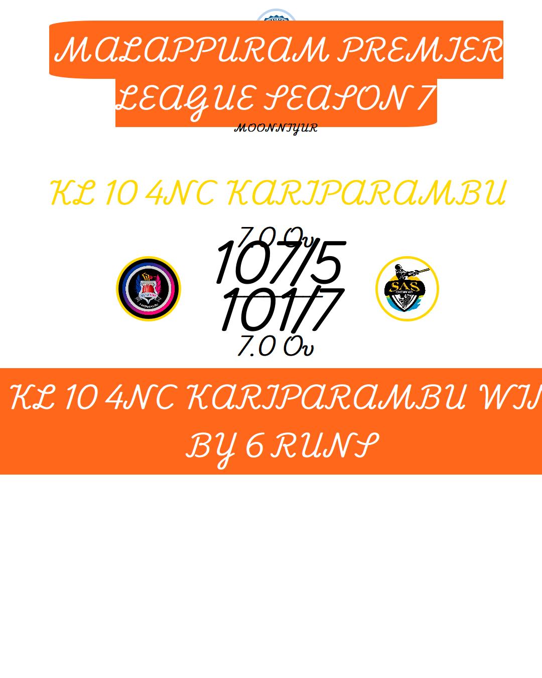 KL 10 4NC KARIPARAMBU WIN BY 6 RUNS