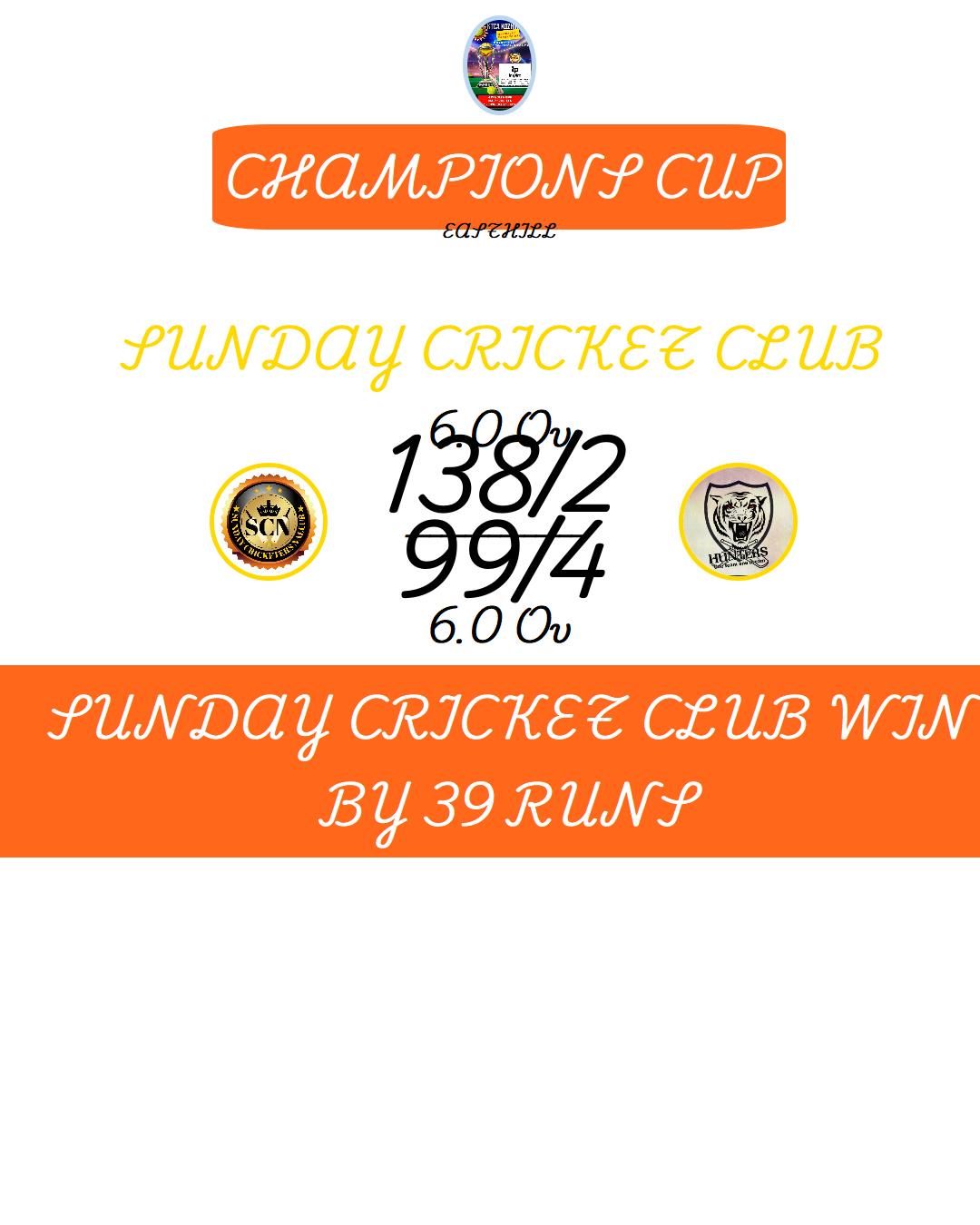 SUNDAY CRICKET CLUB WIN BY 39 RUNS