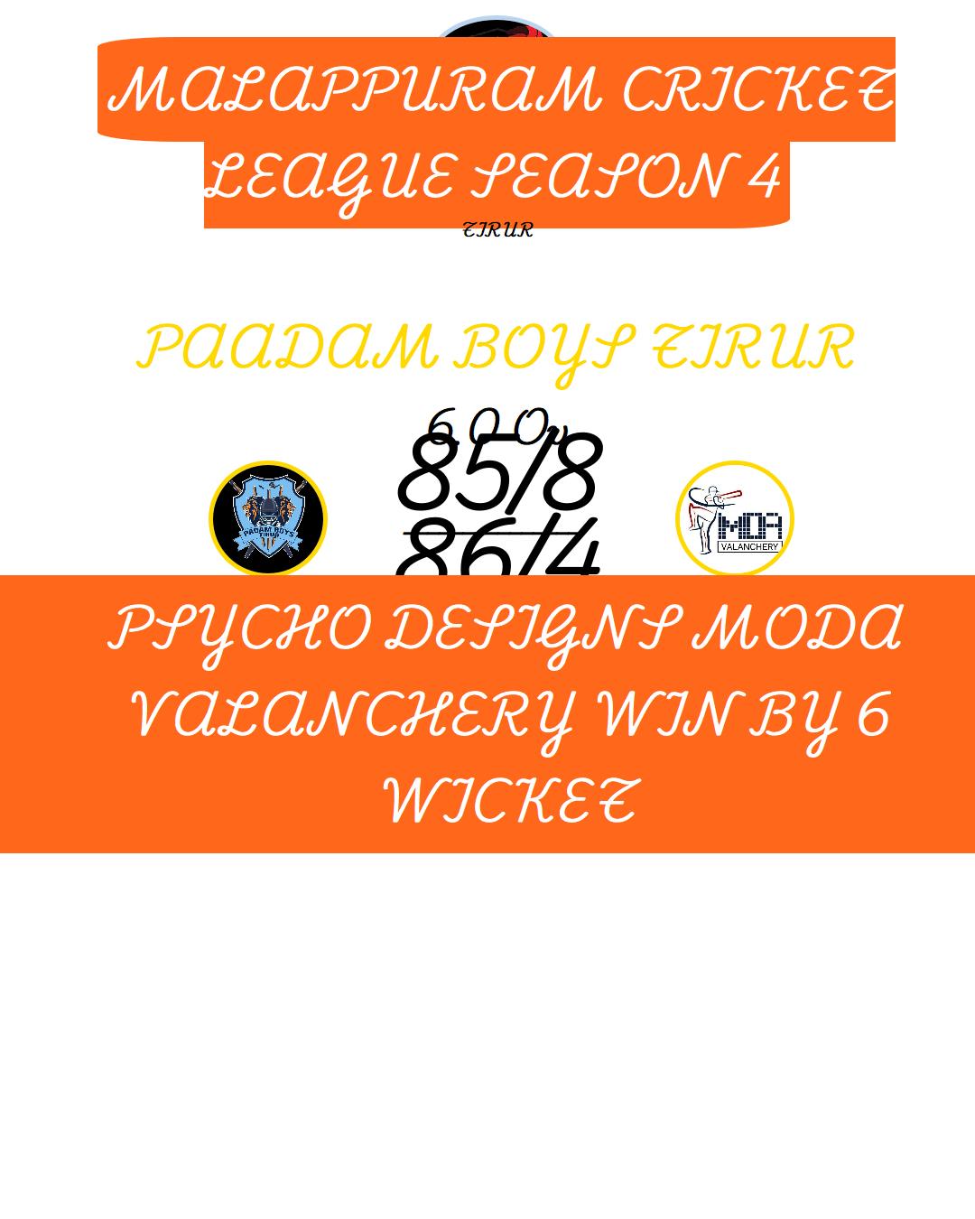 PSYCHO DESIGNS MODA VALANCHERY (MALAPPURAM CRICKET LEAGUE SEASON 4) MATCHES