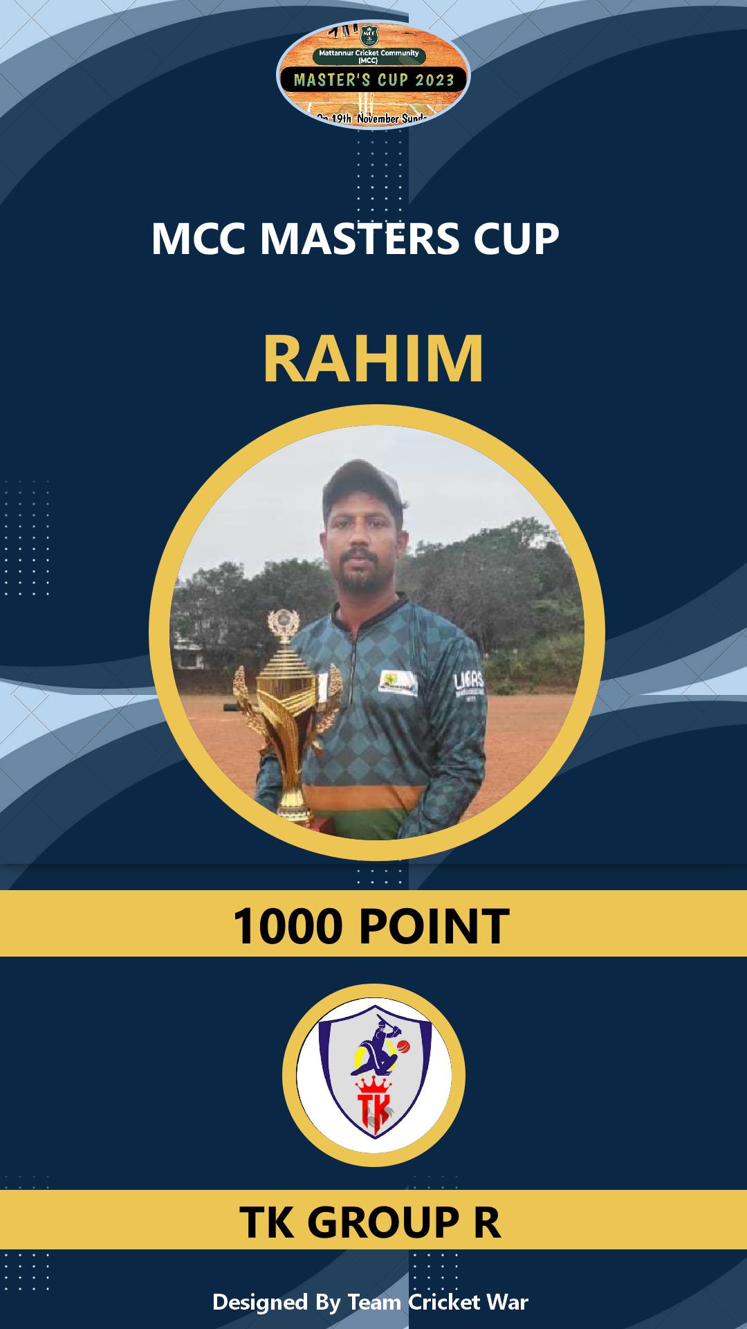 Batsman, AGE : 37 Mattanur Bid Amount : 1000 Team : TK GROUP R Download ID Card VIEW PROFILE |