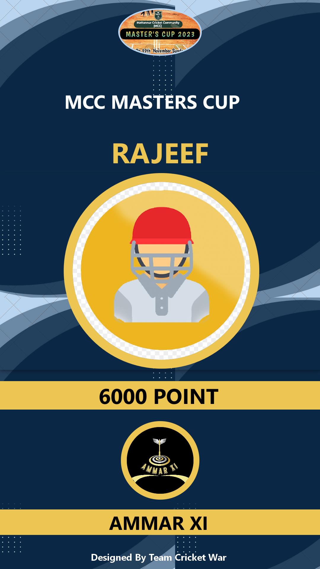Allrounder, AGE : 35 IRITTY Bid Amount : 8000 Team : AMMAR XI Download ID Card VIEW PROFILE |