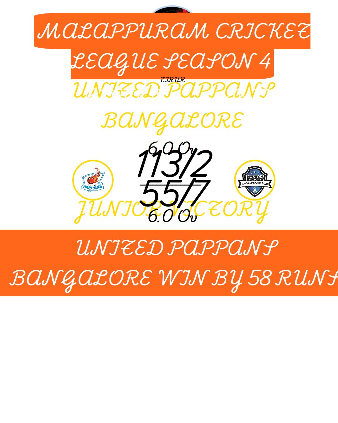 UNITED PAPPANS BANGALORE WIN BY 58 RUNS