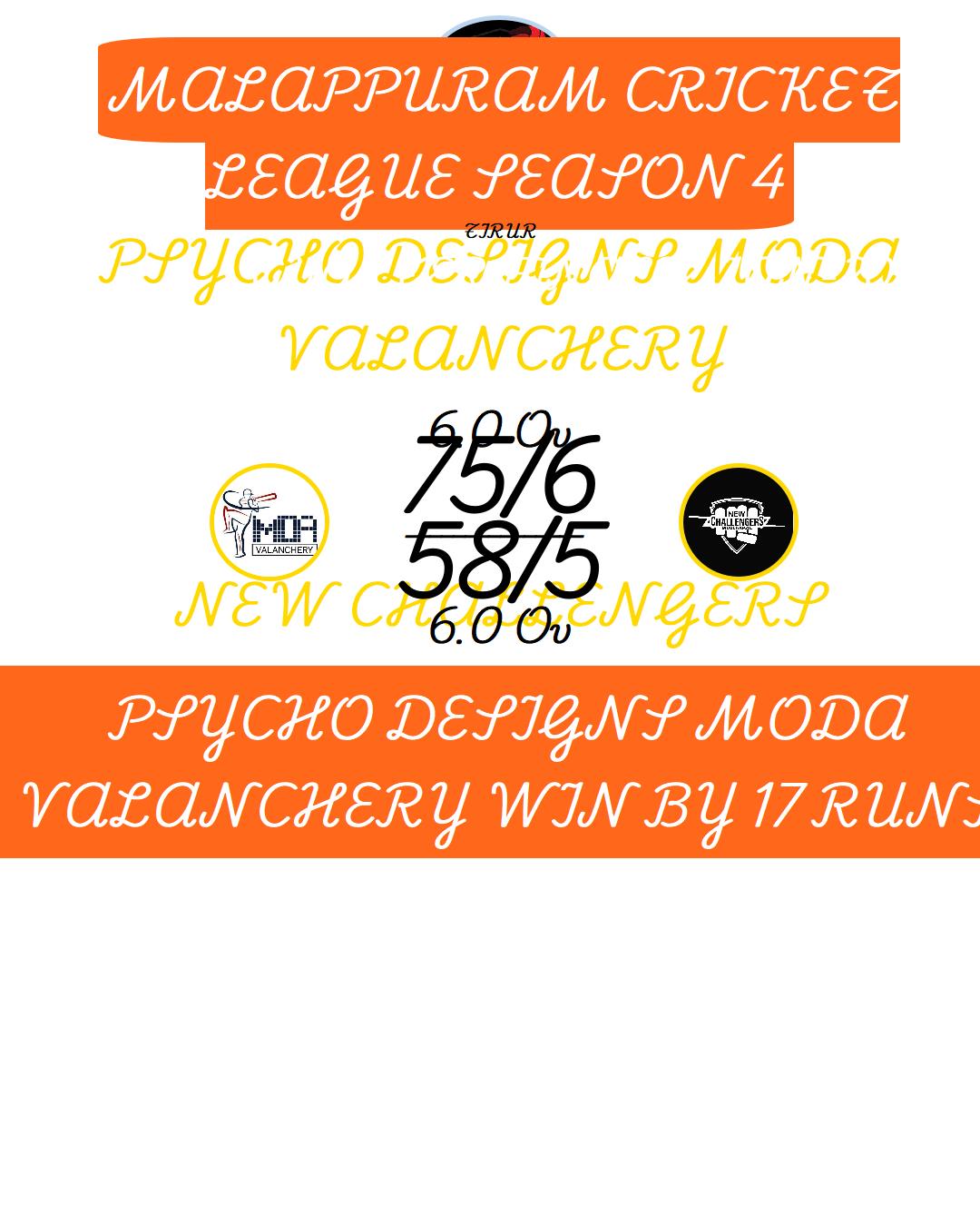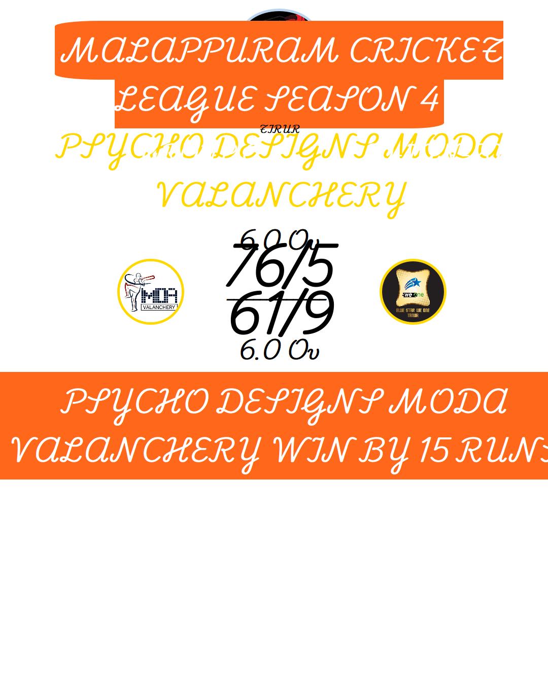 PSYCHO DESIGNS MODA VALANCHERY WIN BY 6 WICKET