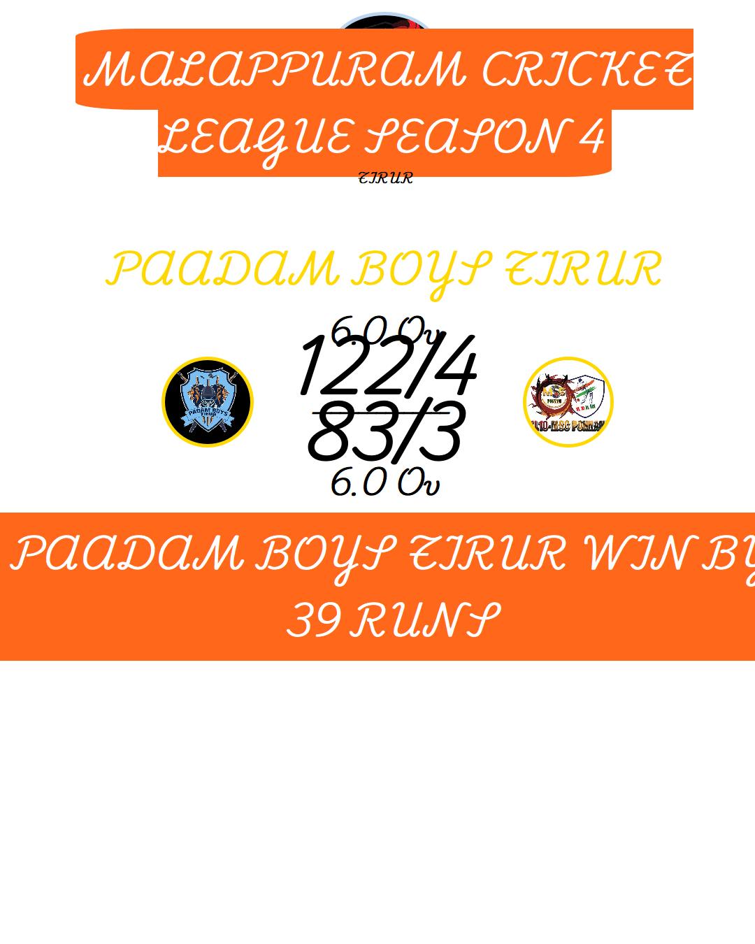 PAADAM BOYS TIRUR WIN BY 39 RUNS