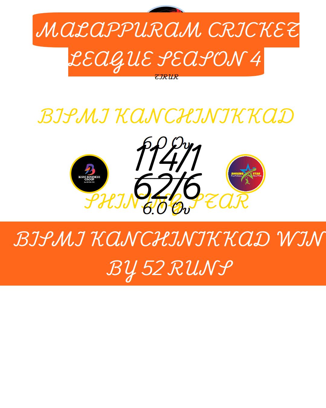 BISMI KANCHINIKKAD WIN BY 52 RUNS